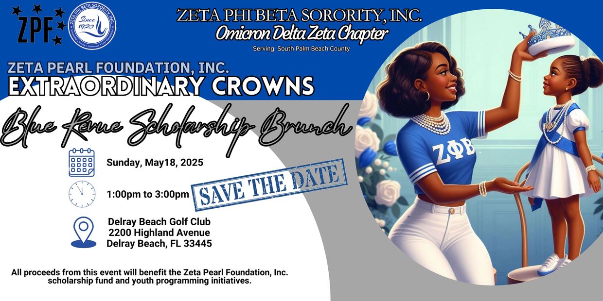 Zeta Pearl Foundation's Extraordinary Crowns Blue Revue Scholarship Brunch (Blue Revue) is a celebration of the best and the brightest in our service area. Since its inception, Zeta Pearl has gathered annually to raise funds in an effort to award scholarships to deserving youth. Our scholarship brunch is fusion of culture, leadership development, and fundraising. We gather to celebrate our current scholarship recipients, honor our past recipients, and pay homage to those who have brought us a mighty long way. Each year we aim to make this event bigger and better.